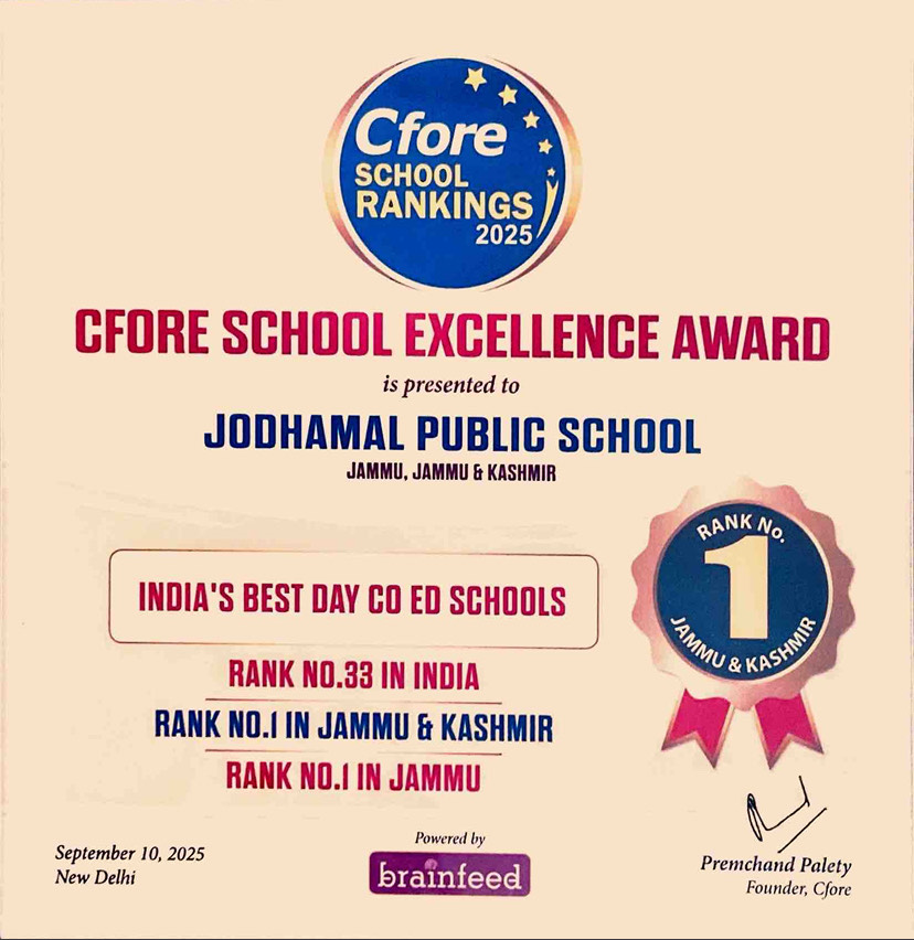 Jodhamal Public School has once again featured as one of high-ranking schools of the country, and ranked 33 rd Pan-India in India’s Best Co-Ed Day Schools Category (80% of the schools in India fall under this category). Further, Jodhamal School was ranked 1 st in J&K and 1 st in Jammu across all Categories in the India School Rankings 2025-26 conducted by C-Fore, a pioneering Indian rating agency, in association with the prestigious Education Magazine, Brainfeed. Leading the School Surveys for over the last two decades, C-fore School Rankings, by far, are considered the most authentic and reliable rankings in the Indian Schools’ and Colleges’ circuits, for their unbiased and objective surveys. Jodhamal School’s Pan-India 33 rd Rank allows the School to share its position with some elite school across the country. The survey was conducted across 226 cities, in 20 different categories in which more than 40,000 persons were interviewed. Jodhamal’s Rank 1 in J&K and Jammu across all parameters is a testimony to the fact that the School has been consistently setting the higher bench-marks of standard in all domains. Jodhamal’s continuing success can be attributed to improved performance across the 15 parameters like Teacher Competency and Relationship, Pedagogy and Relevant Curriculum, Leadership / Governance, Teacher Care & Growth Environment, Personalised Education, Academic Rigour, Sports, Co-Curricular Activities, Infrastructure, Life Skills / Social Intelligence, Placements / Alumni, Parents’ Involvement & Education, Return on Investment / Value for Money, Social Engagement / Inclusivity and Pastoral Care. Mr Nandan Kuthiala, Trustee and Ms. Amita Arora, Vice Principal of the School received the Ranking Certificate and a memento in a glittering Award Ceremony organized in New Delhi. Some other notable winners in their respective states / cities were: Dhirubhai Ambani International School, Mumbai, The Rajkumar College, Rajkot, Genesis Global School, Noida, La Martiniere Boys’ College, Lucknow, The Scindia School, Gwalior, Modern School, Barakhamba Road, New Delhi, Vasant Valley School, New Delhi, Mayo College Girls’ School, Ajmer, The Punjab Public School, Nabha, Pathways School, Gurgaon, Daly College, Indore etc. The organizers congratulated all the winners and highlighted the changing preference from pure academic-based education to holistic education. They also spoke on the evolution of education in the 21st Century and laid thrust on NEP 2020. Education is a dynamic process which has evolved with the need of the time. The organizers appreciated Jodhamal Public School for giving the education par excellence to the next generation. Sharing his happiness on this moment of pride, Mr Nandan Kuthiala, Trustee of the School said "The award is a testimony of the hard work, dedication, and sense of purpose of each and every stake-holder of the Jodhamal fraternity". He also thanked the Staff, Students and Parents of team Jodhamal for their collaborative approach and hard work which made this award possible.