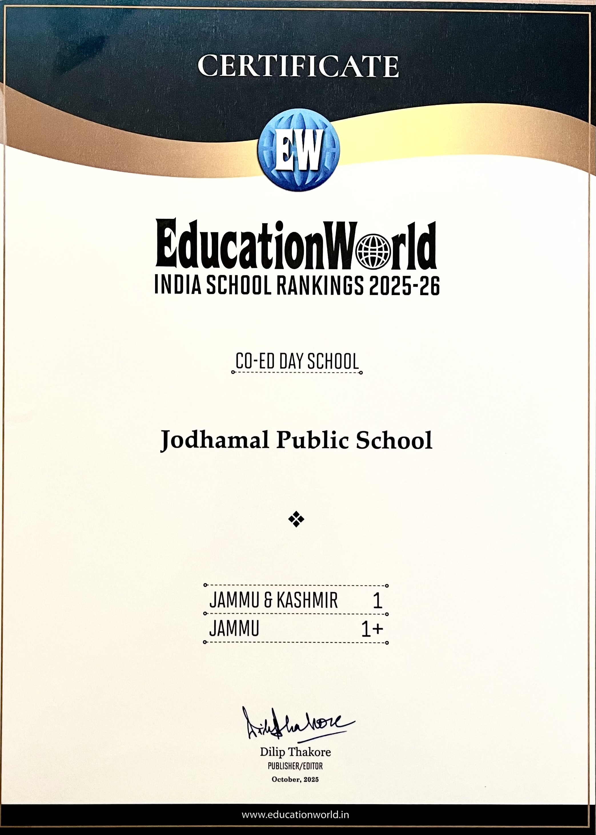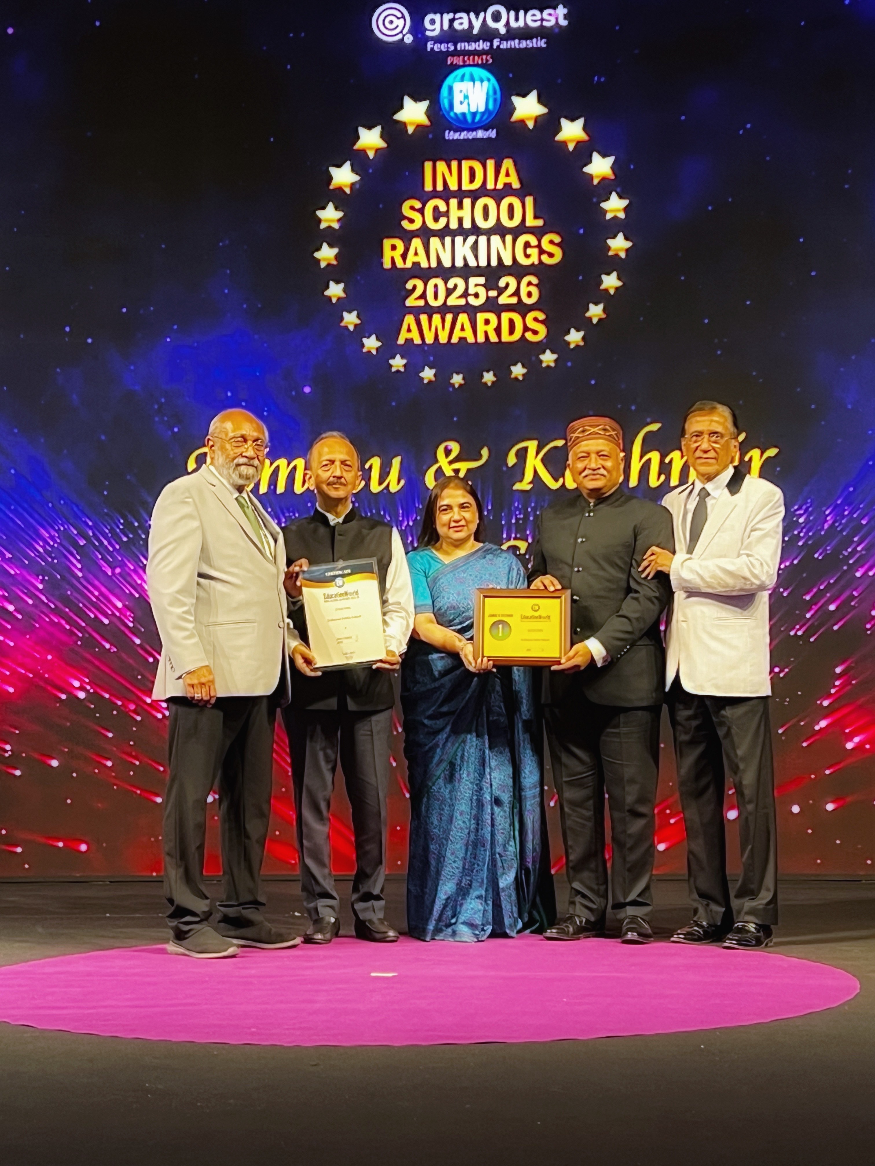 Jodhamal Public School has once again been ranked as the top School in J&K, consecutively for the eleventh year in a row in the India School Rankings 2025-26 published by the prestigious Magazine, Education World. This year the School has bagged the 1+ Rank in Jammu & J&K in the category of Co-Ed Day Schools. For the past 19 years, Education Worldhas been conducting a nationwide survey and more than 15,000 top schools all over India participate in this survey. It is a very rare feat for a school to be the Top Ranked in a State for 11 years in a row. This year the Survey was conductedin collaboration with AZ Research Partners, Bengaluru. These rankings, by far, are regarded as the most authentic rankings in the Indian Schools’ and Colleges’ circuits for their unbiased and objective surveys. Jodhamal’scontinuing success can be attributed to improved performance across the 14 parameters like Academic Reputation, Competence of Faculty, Co- Curricular Activities, Infrastructure, Discipline, Community Service, Sports Education, Leadership, Management quality, Life Skills & teacher-student ratio. Over the past four months AZ Research Partnerspersonnel interviewed more than 25,000 parents, principals, teachers and senior school students in 489 cities countrywide, and persuaded them to rate schools in their region on a ten-point scale across 14 parameters of education excellence. The glittering Awards Ceremony was held at The Pullman Hotel, Aerocity, Delhi. The three-day event, organized by EducationWorld, brought together distinguished leaders and changemakers from the education sector to celebrate excellence in schools across India. From the School, the Ceremony was attended by Mr Nandan Kuthiala, Trustee, Mrs Arati Kuthiala, Director and Dr. Deep Khare, Principal. The trio from Jodhamal were felicitated with the Education World Indian School Rankings 2025-26 Certificate and the citation. This is noteworthy that recently Jodhamal School was top ranked in both Jammu and Jammu and Kashmir by another prestigious educational magazine, Brainfeed. The survey was conducted in collaboration with C-Fore. On behalf of the Education World Team, Mr Dilip Thakoreand Dr. Sumer Singh, congratulated all the winners and highlighted the changing preference from Pure academic-based education to holistic education. They also spoke on the evolution of education in the 21st Century, which has moved in since with the need of the time. Mr Dilip Thakoreand Dr Sumer Singhappreciated Jodhamal Public School for giving the education par excellence to the next generation. Sharing his happiness on this moment of pride, Mr Nandan Kuthiala, Trustee of the School said "The award is a testimony of the hard work, dedication, and sense of purpose of each and every stake-holder of the Jodhamal fraternity". He also thanked the Staff, Students and Parents of team Jodhamal for their collaborative approach and hard work which made this award possible. Some other notable winners in their respective states / cities were Vasant Valley School, The Doon School, Mayo College, DPS RK Puram, Mayo College Girls’School, The Cathedral and John Canon School Mumbai, Sanskriti School New Delhi, Mallya International Bangalore, Modern School, New Delhi, Welham Girls’School, Dehradun, Scindia School, Gwalior, The Daly College, Indore, The Rajkumar College, Rajkot etc.