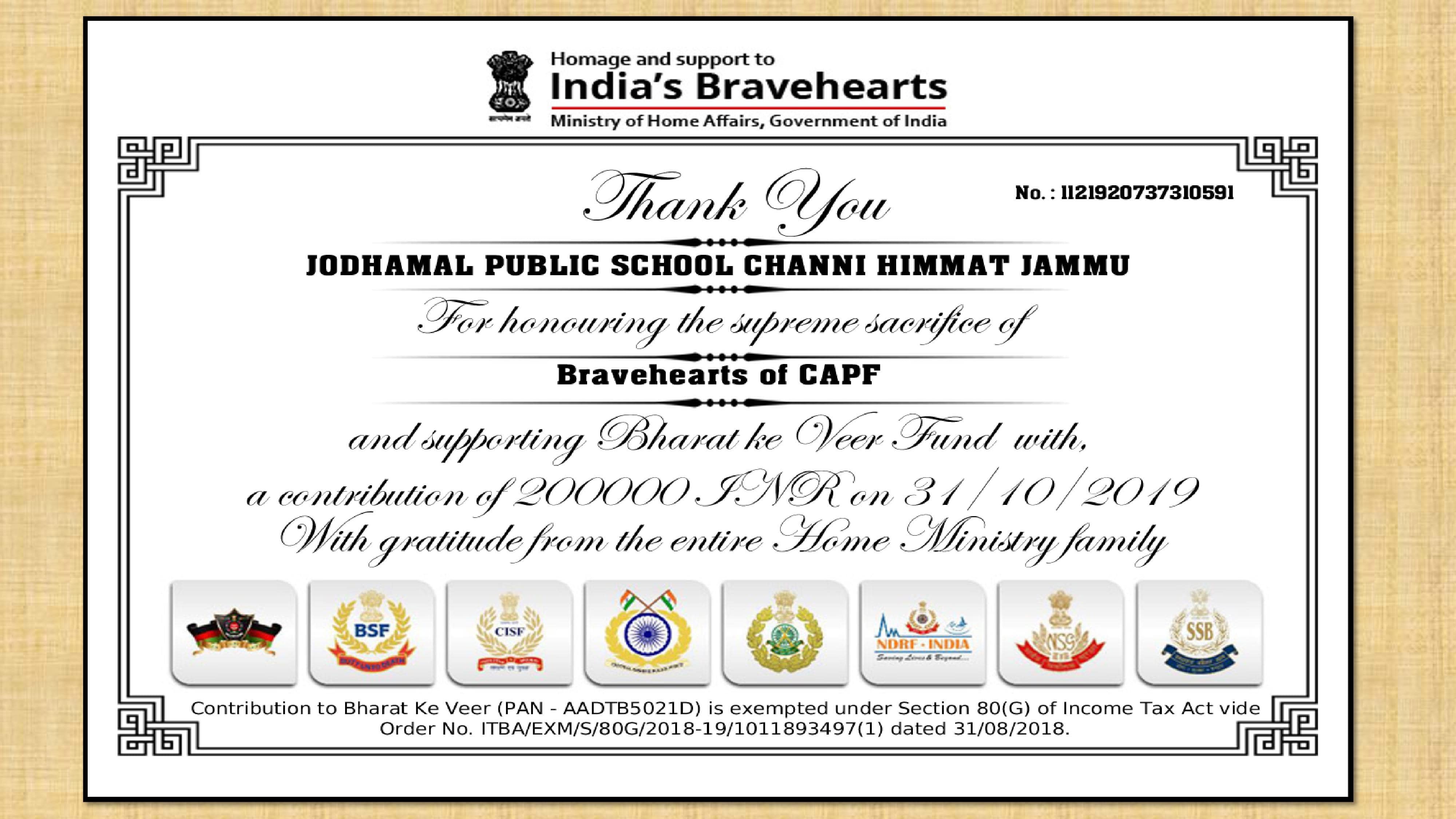 Programme started by invoking the Gods with a wonderful choreographed Krishan Leela by the junior students of Jodhamal School. Scholarship of Rs. 10,000 each were given to meritorious girls students studying in class 11th of Govt. Schools of border areas of Jammu Province. 8 girls each from the border arear of Jammu, Samba, Poonch, Kathua&Rajouri districts were awarded the scholarship.